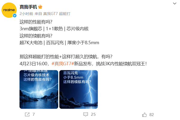 性能方面,真我 GT7 会搭载天玑 9400+ 这个旗舰级的 5G 智能体 AI 芯片 。据悉,和真我 GT7一样首批用上天玑 9400+ 芯片的,有昨天已发布的 OPPO Find X8s/X8s+,以及定档 4 月 21 日发布的 vivo X200s。天玑 9400+ 采用第二代全大核架构,拥有 1 个 Arm Cortex - X925 超大核、3 个 Cortex - X4 超大核和 4 个 Cortex - A720 大核。联发科表示,这种架构可以提升处理器的单线程、多线程性能。