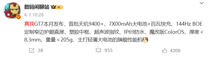 话说回来,此前知名数码博主@数码闲聊站就已经把真我 GT7 这款手机的配置“扒”出来了。小雷带着大家一块看看吼。