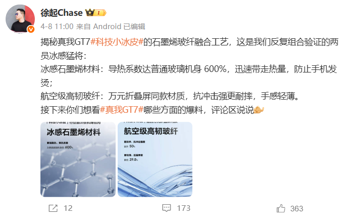 工艺方面,此前官方的预热微博显示,真我 GT7 将首发“科技小冰皮”。小雷之前一看这名字,感觉又走上了卷散热的赛道。果不其然,真我 GT7 将采用全新的石墨烯冰感科技机身,以及行业首创的石墨烯玻纤融合工艺,“散热更强、更轻薄、更耐摔”。realme 副总裁徐起也曾在微博“剧透”过,这种材料可以迅速带走热量,防止手机发烫。游戏党们岂不是狂喜?